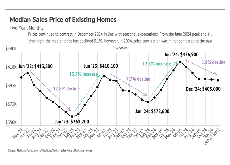 - Home Prices Remain Steady: While home prices dipped slightly in Q4 2024, their stability in the latter half of the year suggests they could climb to new highs in 2025.